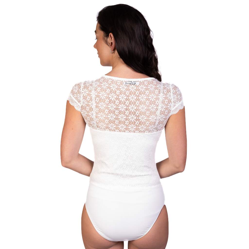 Beflügelt von einem hellen, harmonischen Farbschema präsentiert sich dieses Spitzen-Top in strahlendem CremeWeiß. Die klare Optik mit V-Ausschnitt und Blumenstickerei kombiniert sich mit der sofortigen Wirkung eines modernen, minimalistischen Styles. Der weiche Stoff lässt es sich für jede Jahreszeit tragen – ob im Büro, beim Picknick oder zu Feierlichkeiten. Body aus Spitze mit V-Ausschnitt und halbarm Ärmeln in Cremeweiss Der Damenbody kann als Trachtenbody oder als normales Oberteil getragen werden und ist sehr vielseitig kombinierbar!